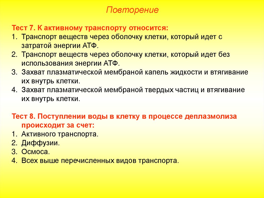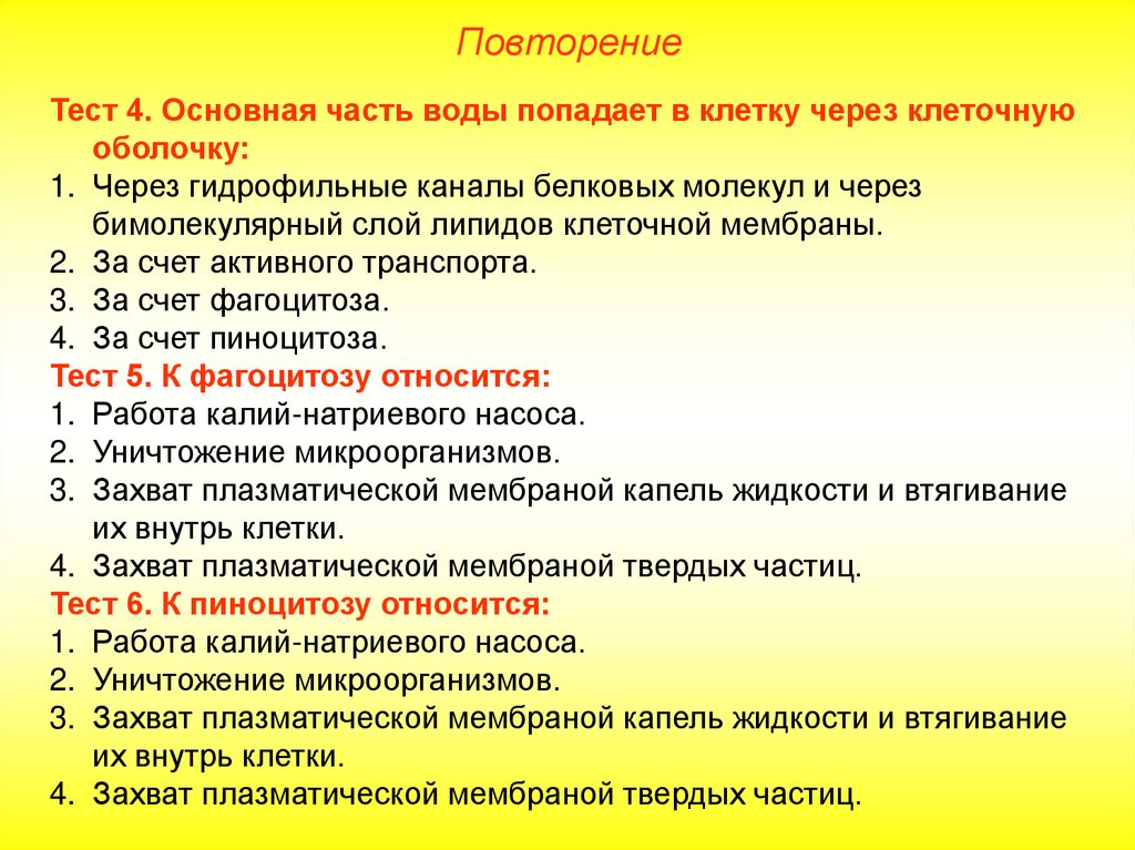 ПовторениеТест 4. Основная часть воды попадает в клетку через клеточную