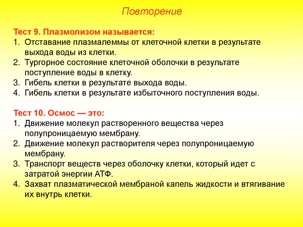 Тест 8. Поступлении воды в клетку в процессе деплазмолиза