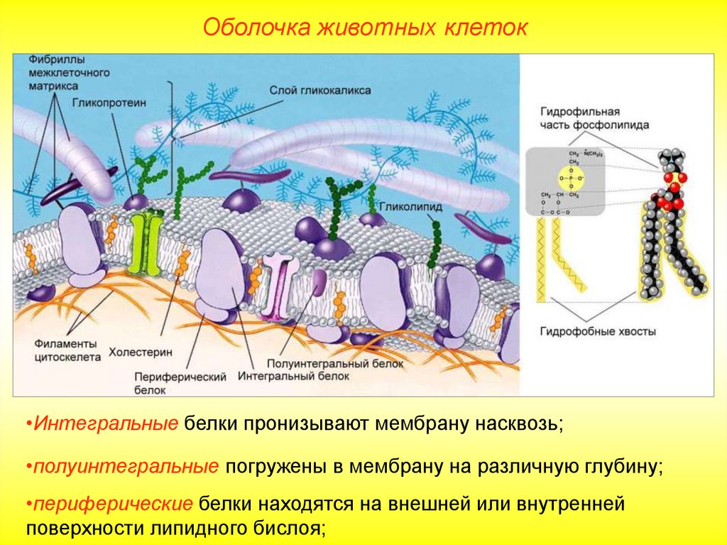 Оболочка животных клеток•Интегральные белки пронизывают мембрану насквозь;