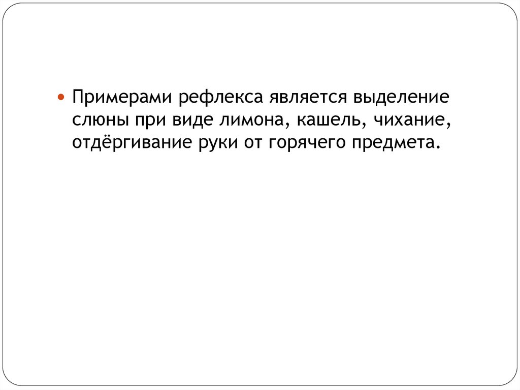 Примерами рефлекса является выделениеслюны при виде лимона, кашель, чихание,