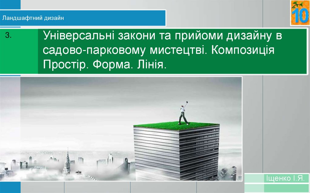 У ландшафтному дизайні ураховуються універсальнізакони та структурні елементи проекту: композиція,