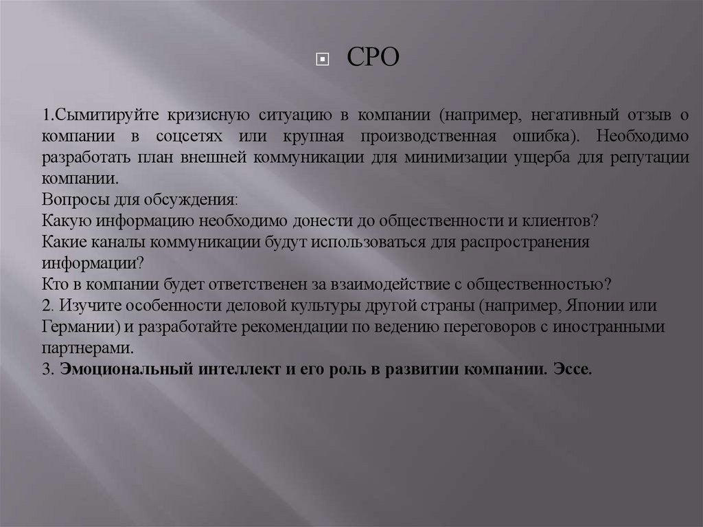 СРО1.Сымитируйте кризисную ситуацию в компании (например, негативный отзыв о