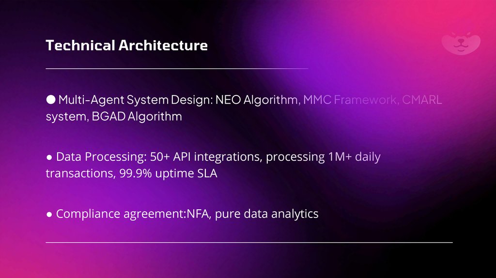 Technical Architecture● Multi-Agent System Design: NEO Algorithm, MMC Framework, CMARL