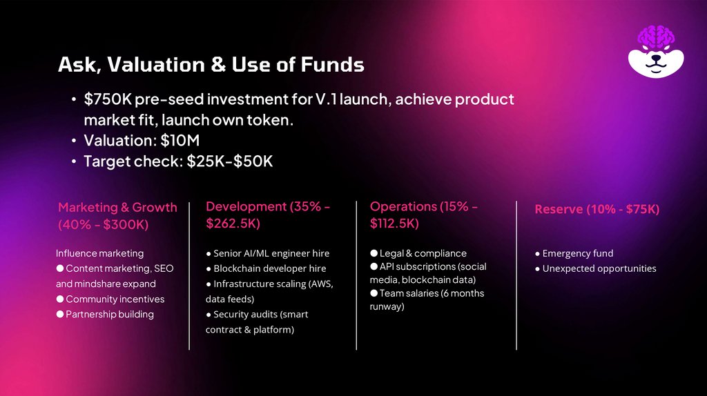 Ask, Valuation & Use of Funds• $750K pre-seed investment for V.1 launch, achieve product