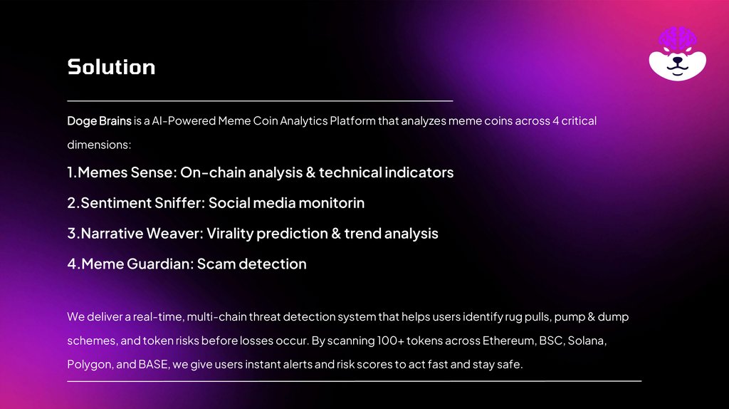 SolutionDoge Brains is a AI-Powered Meme Coin Analytics Platform that analyzes meme coins across 4 critical