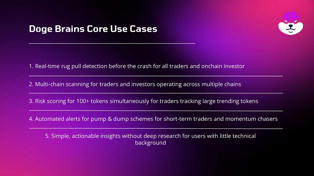 Doge Brains Core Use Cases1. Real-time rug pull detection before the crash for all traders and onchain investor