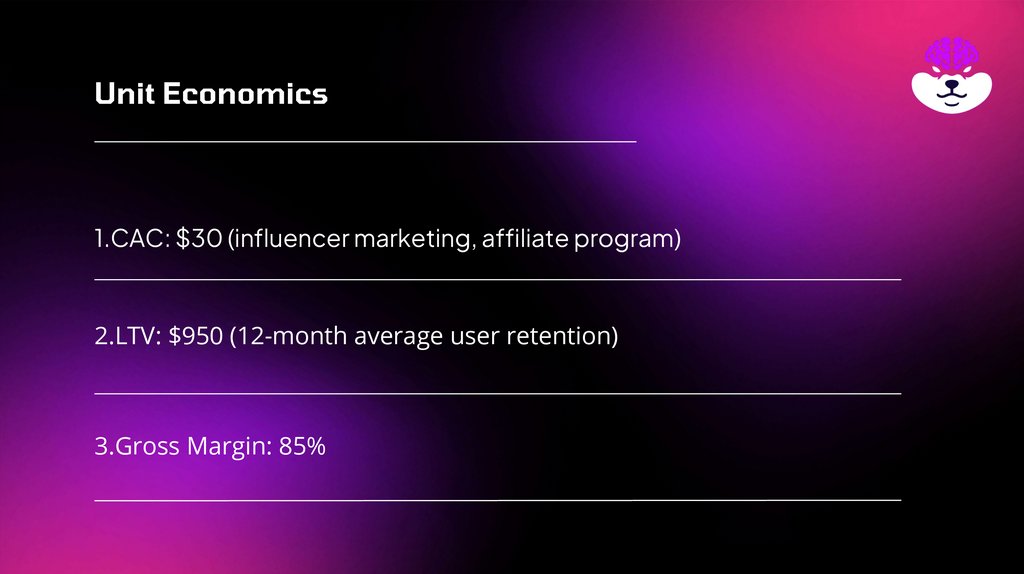 Unit Economics1.CAC: $30 (influencer marketing, affiliate program)