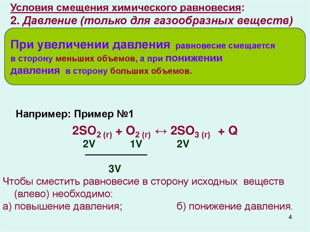 Условия смещения химического равновесия:2. Давление (только для газообразных веществ)