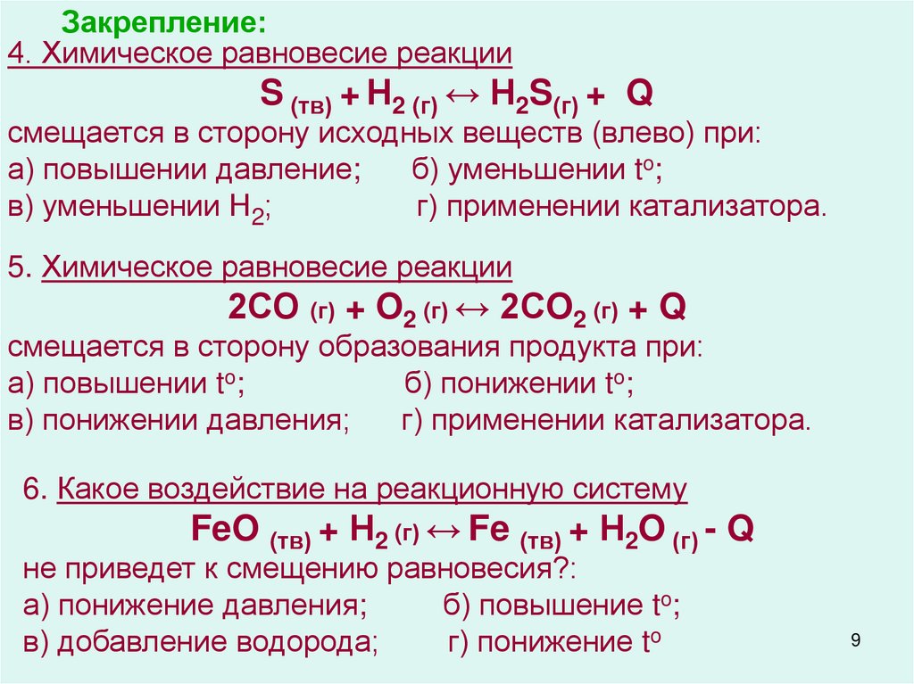 Закрепление:7. Какое воздействие на реакционную систему