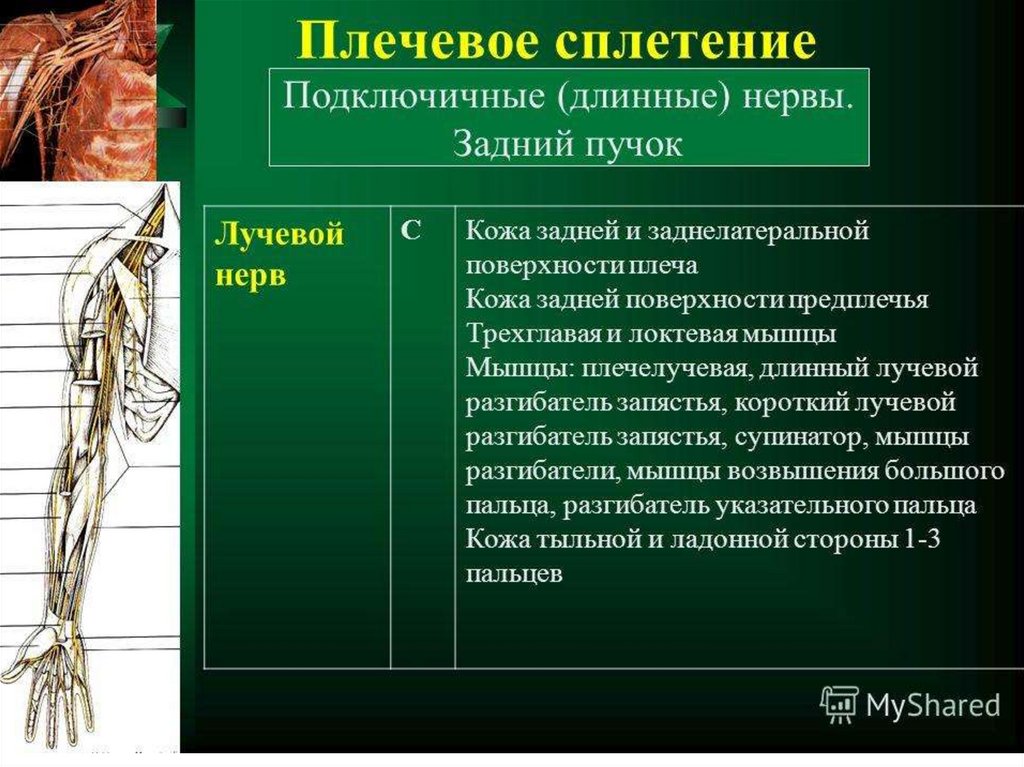 Лучевой нерв – начинается от заднего пучка плечевого сплетения. Даёт ветви к