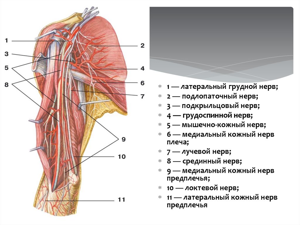 Медиальный кожный нерв плеча – начинается от медиального пучка плечевого