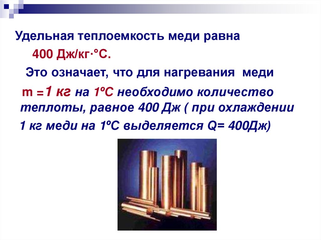 Удельная теплоемкость меди равна400 Дж/кг·°С.