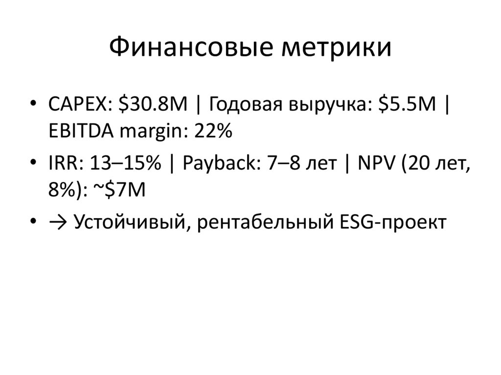 Финансовые метрики• CAPEX: $30.8M | Годовая выручка: $5.5M |