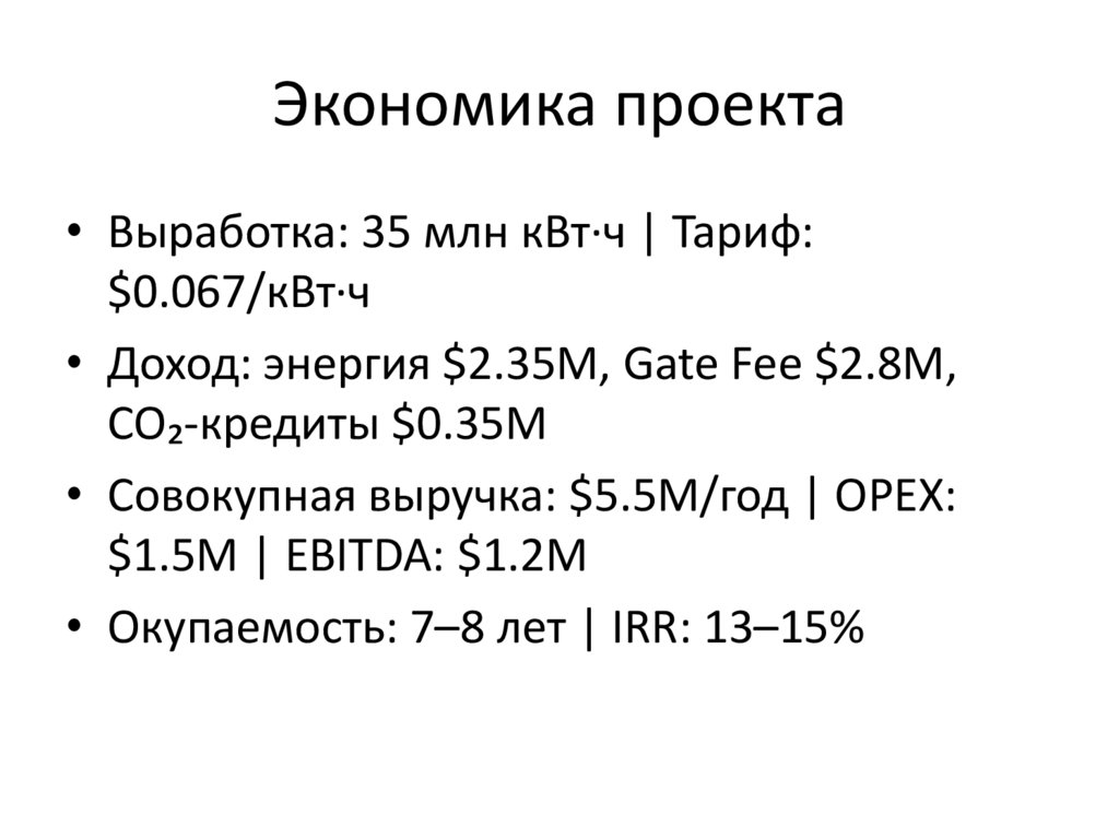 • Окупаемость: 7–8 лет | IRR: 13–15%