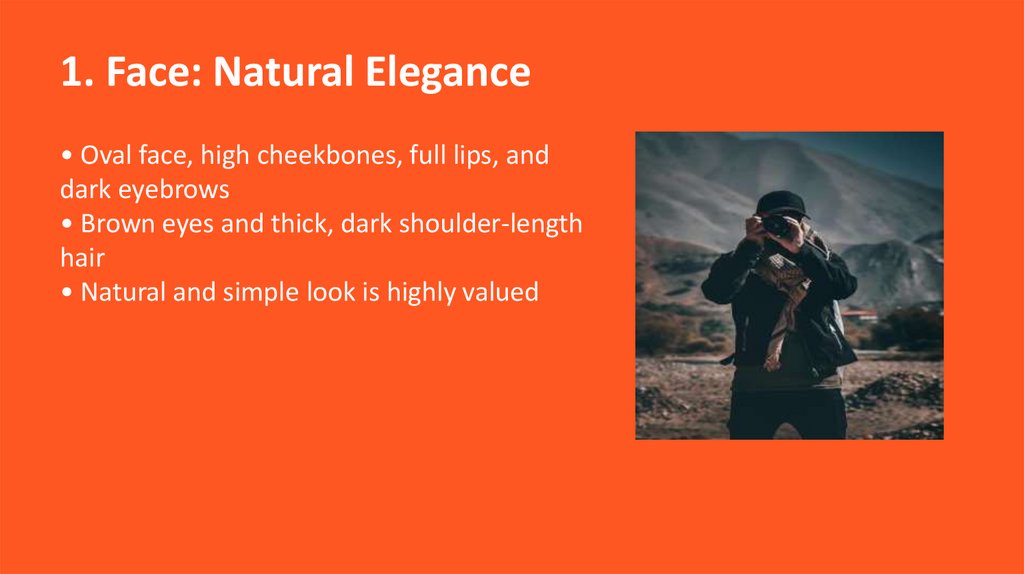 1. Face: Natural Elegance• Oval face, high cheekbones, full lips, and