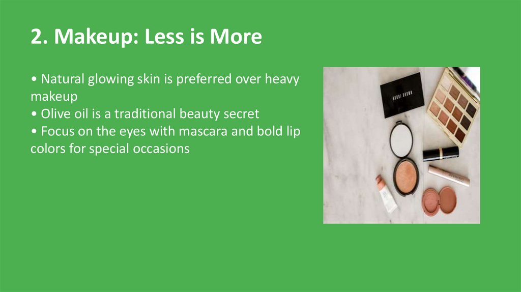 2. Makeup: Less is More• Natural glowing skin is preferred over heavy