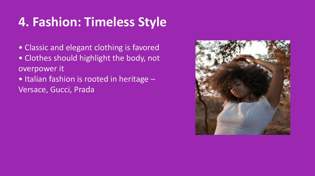 4. Fashion: Timeless Style• Classic and elegant clothing is favored