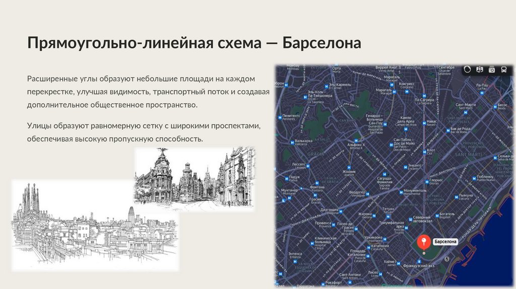 Прямоугольно-линейная схема — БарселонаРасширенные углы образуют небольшие площади на каждом