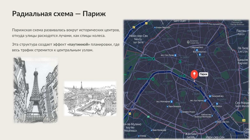 Радиальная схема — ПарижПарижская схема развивалась вокруг исторических центров,