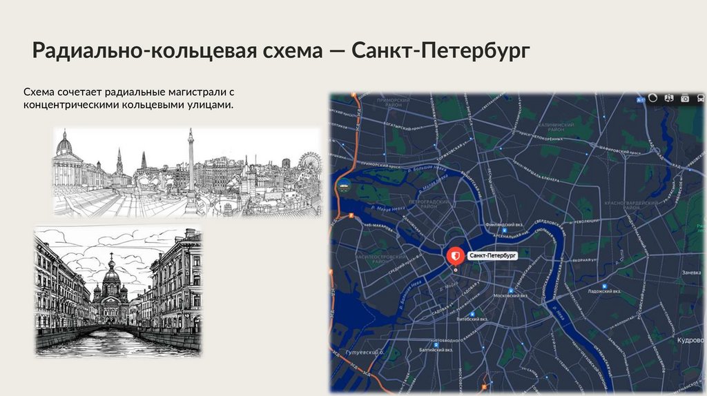 Радиально-кольцевая схема — Санкт-ПетербургСхема сочетает радиальные магистрали с