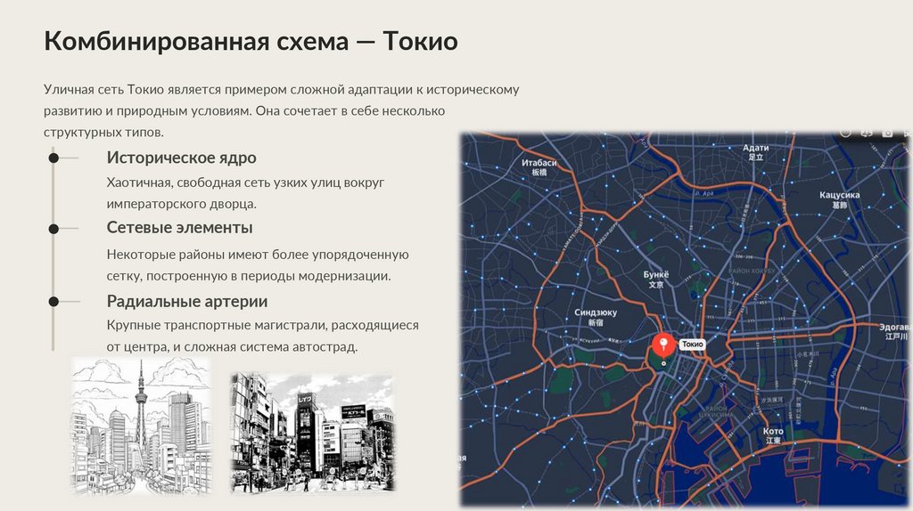 Комбинированная схема — ТокиоУличная сеть Токио является примером сложной адаптации к историческому