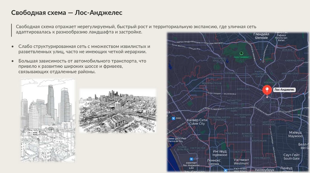 Свободная схема — Лос-АнджелесСвободная схема отражает нерегулируемый, быстрый рост и территориальную экспансию, где уличная сеть