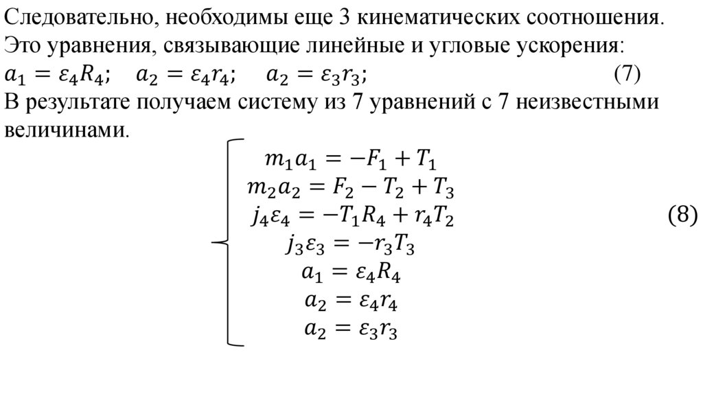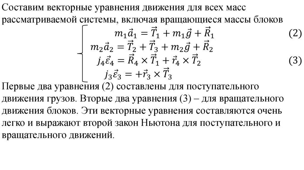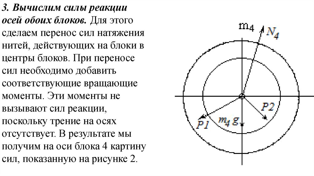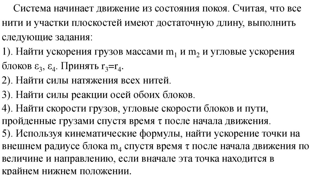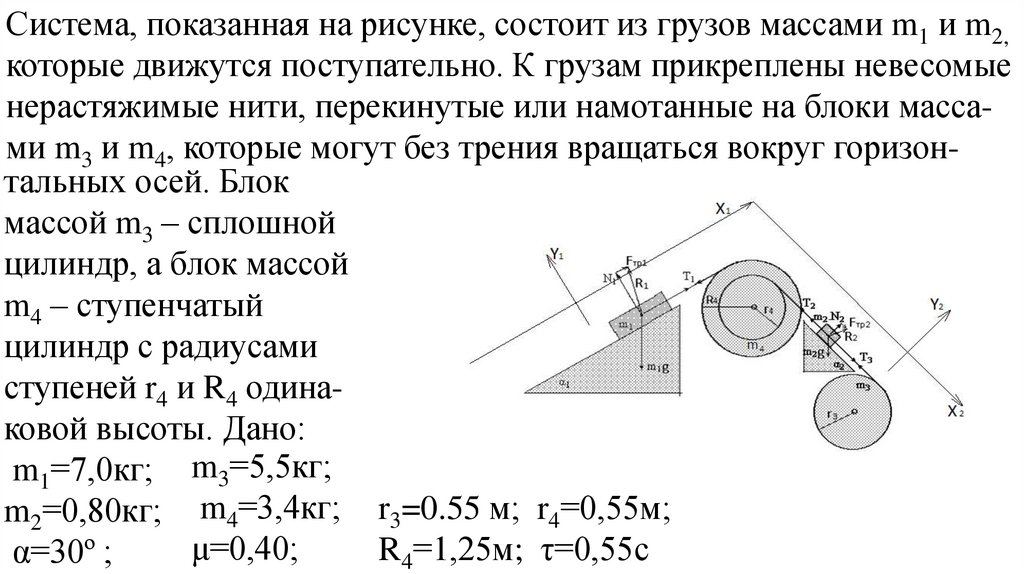 нерастяжимые нити, перекинутые или намотанные на блоки массами m3 и m4, которые могут без трения вращаться вокруг горизонтальных осей. Блок