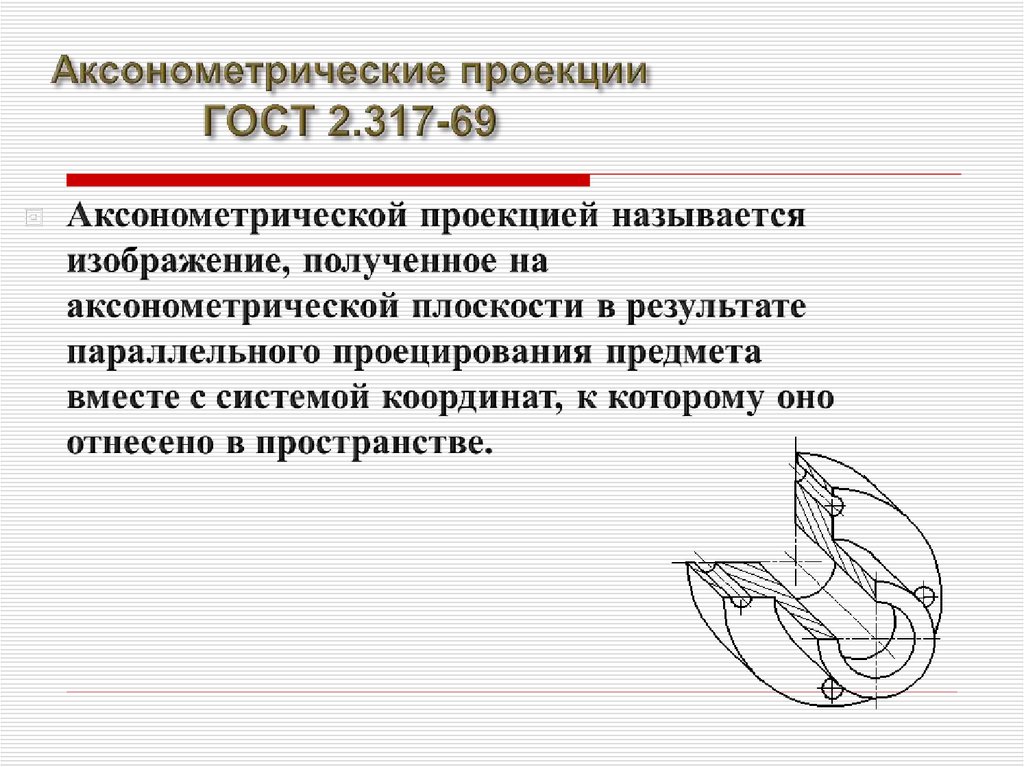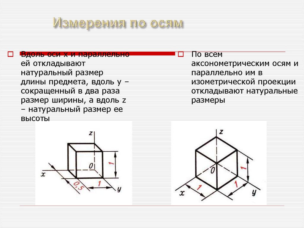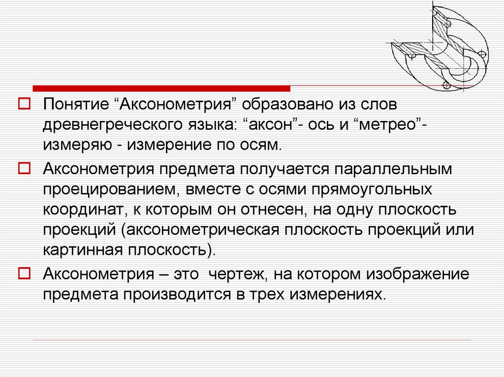 Понятие “Аксонометрия” образовано из словдревнегреческого языка: “аксон”- ось и “метрео”измеряю - измерение по осям.