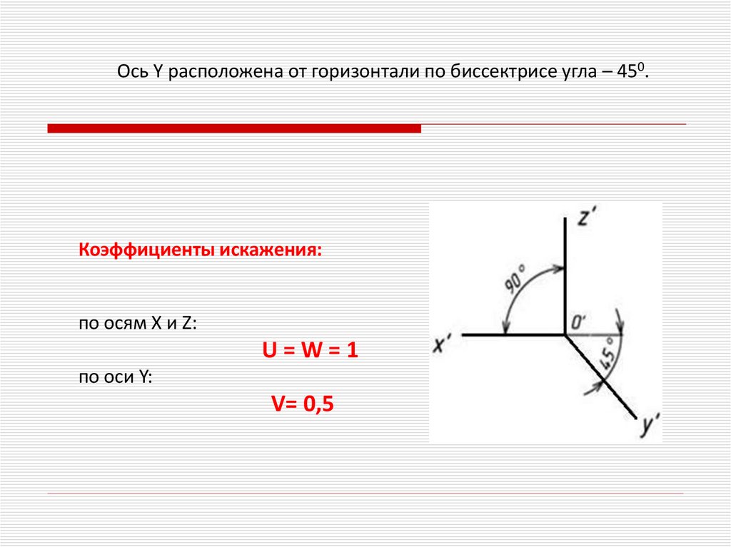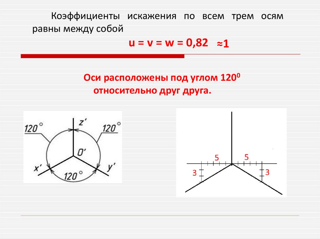 коэффициент искажения по всем осям ГОСТ рекомендует строить безсокращения равной единице, что соответствует увеличению