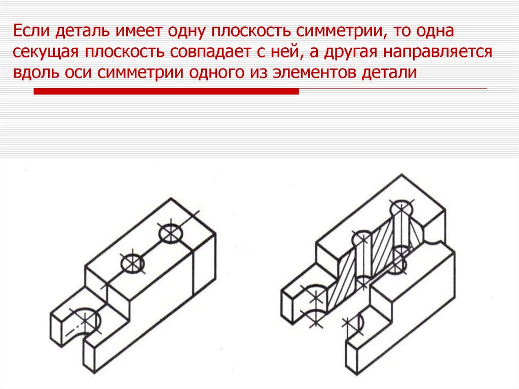 Если деталь имеет одну плоскость симметрии, то однасекущая плоскость совпадает с ней, а другая направляется