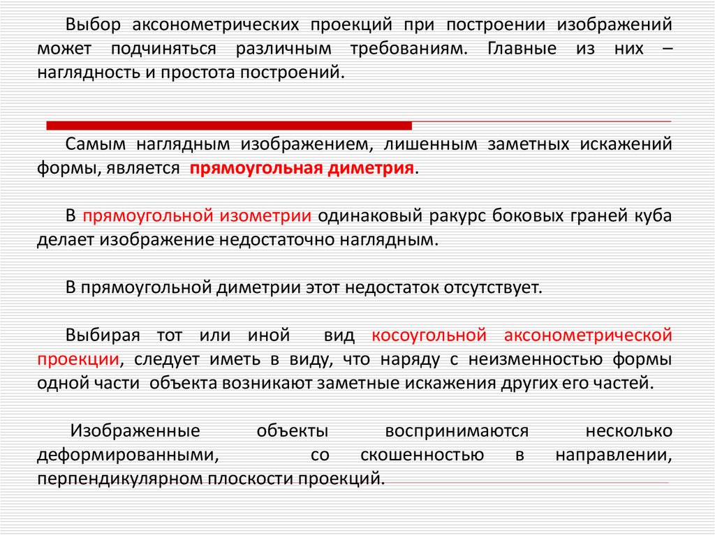 Выбор аксонометрических проекций при построении изображенийможет подчиняться различным требованиям. Главные из них –