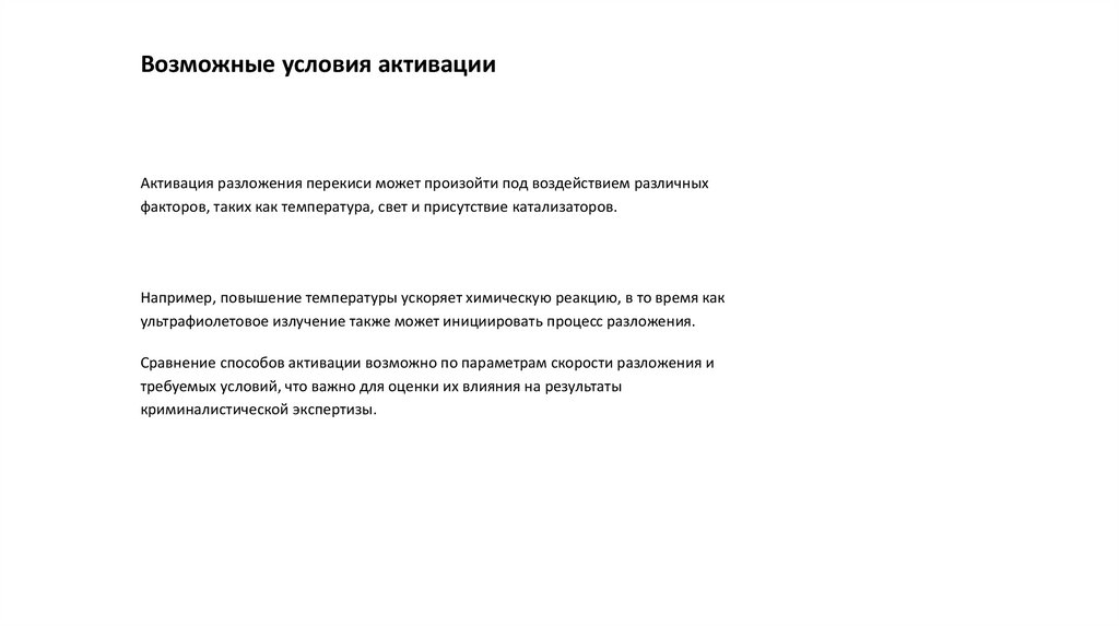 Возможные условия активацииАктивация разложения перекиси может произойти под воздействием различных