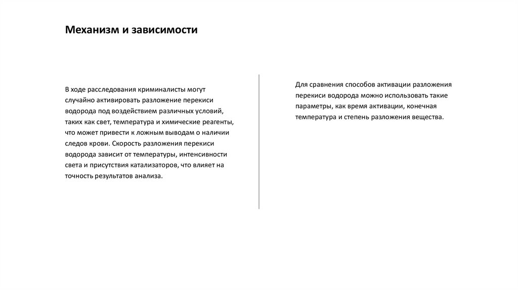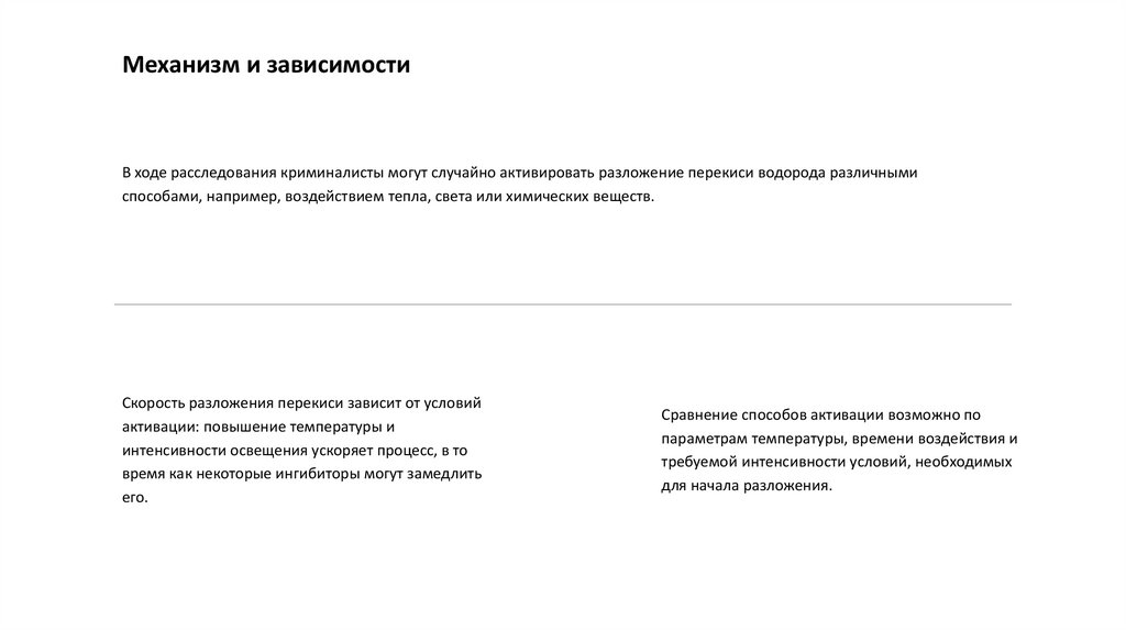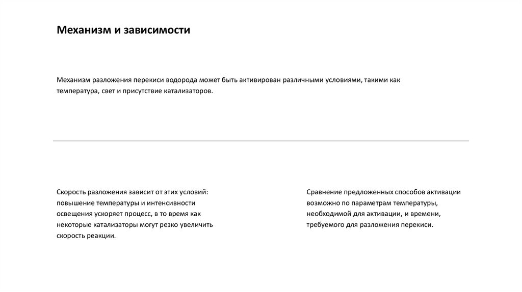 Механизм и зависимостиМеханизм разложения перекиси водорода может быть активирован различными условиями, такими как