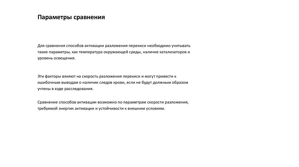 Параметры сравненияДля сравнения способов активации разложения перекиси необходимо учитывать