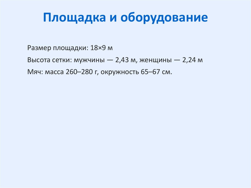 Высота сетки: мужчины — 2,43 м, женщины — 2,24 м
