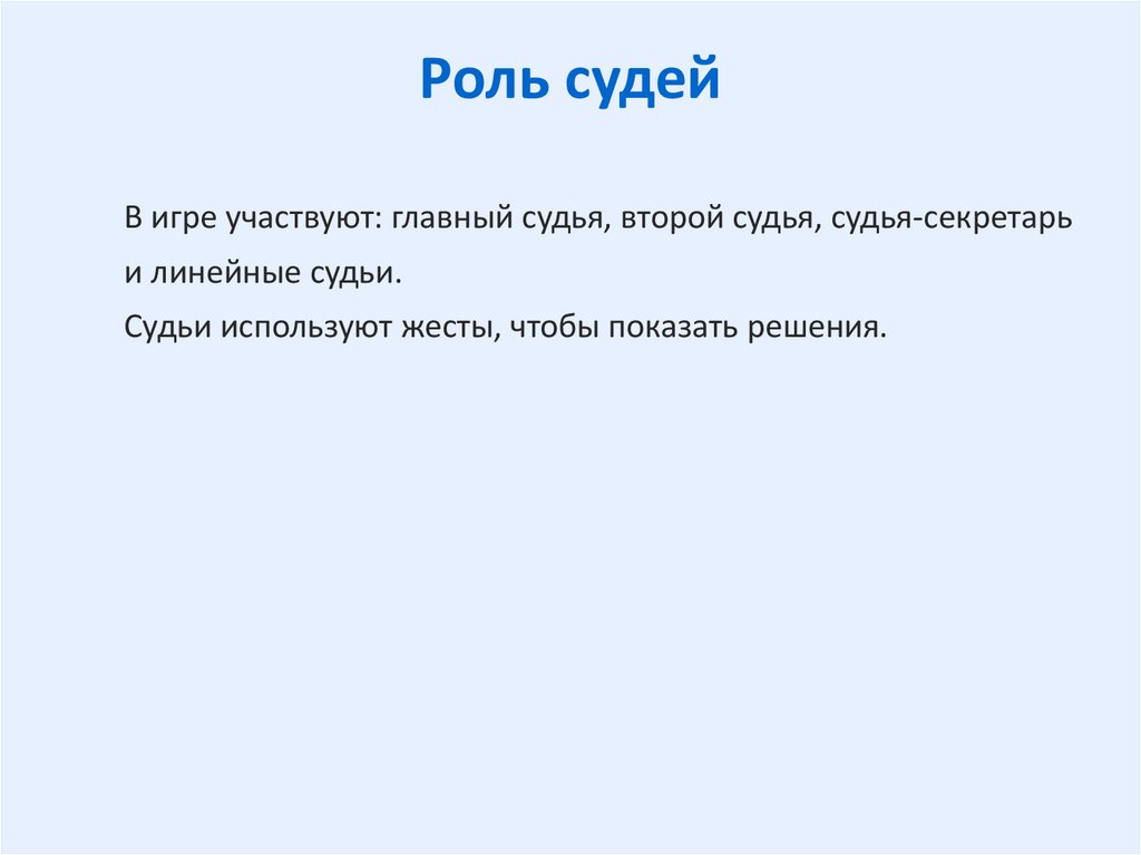 Роль судейВ игре участвуют: главный судья, второй судья, судья-секретарь