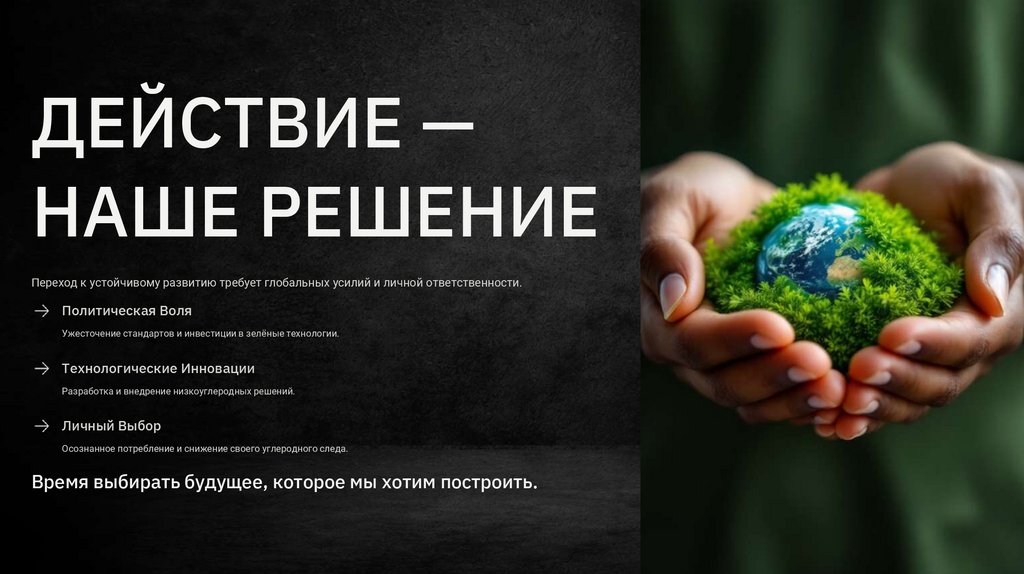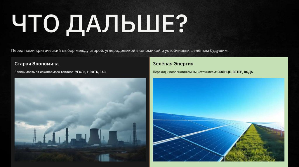 ЧТО ДАЛЬШЕ?Перед нами критический выбор между старой, углеродоемкой экономикой и устойчивым, зелёным будущим.