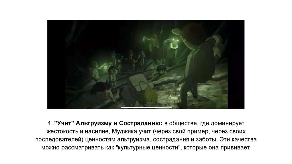 4. "Учит" Альтруизму и Состраданию: в обществе, где доминируетжестокость и насилие, Муджика учит (через свой пример, через своих