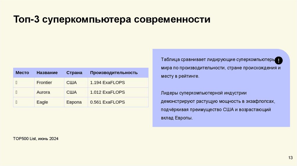 Топ-3 суперкомпьютера современностиТаблица сравнивает лидирующие суперкомпьютеры