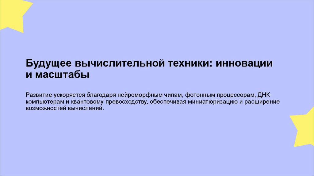 Развитие ускоряется благодаря нейроморфным чипам, фотонным процессорам, ДНКкомпьютерам и квантовому превосходству, обеспечивая миниатюризацию и расширение