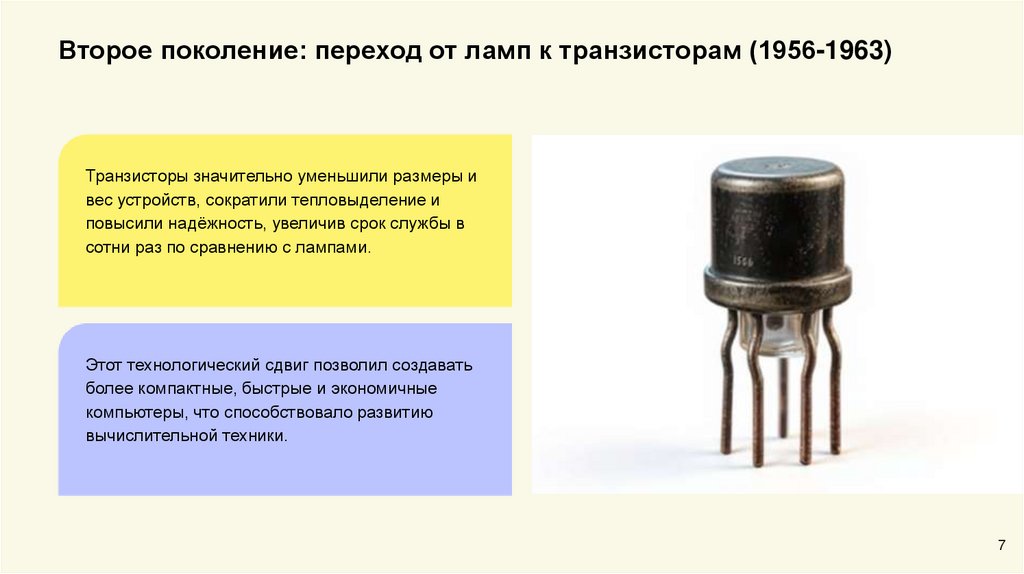 Второе поколение: переход от ламп к транзисторам (1956-1963)Транзисторы значительно уменьшили размеры и