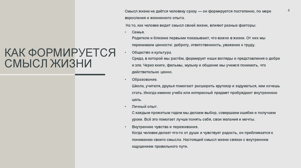 Смысл жизни не даётся человеку сразу — он формируется постепенно, по меревзросления и жизненного опыта.