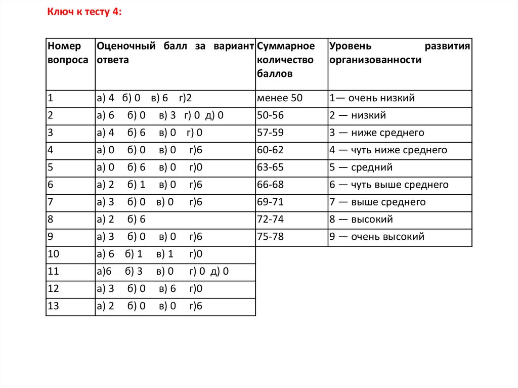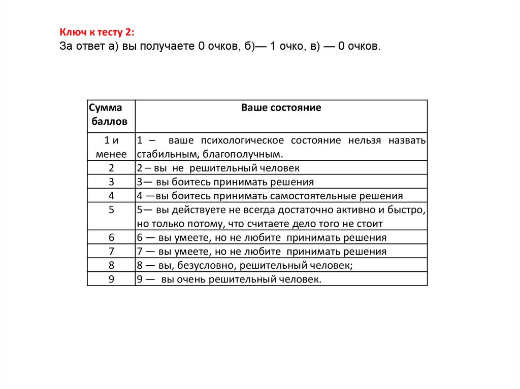 Ключ к тесту 2:За ответ а) вы получаете 0 очков, б)— 1 очко, в) — 0 очков.