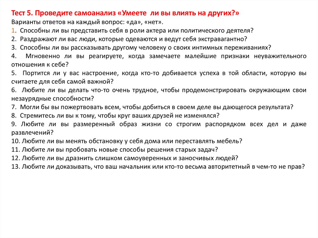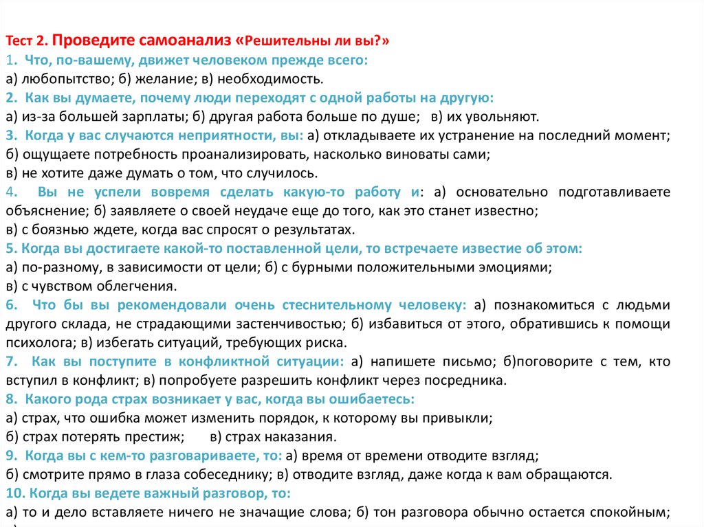 Тест 2. Проведите самоанализ «Решительны ли вы?»1. Что, по-вашему, движет человеком прежде всего: