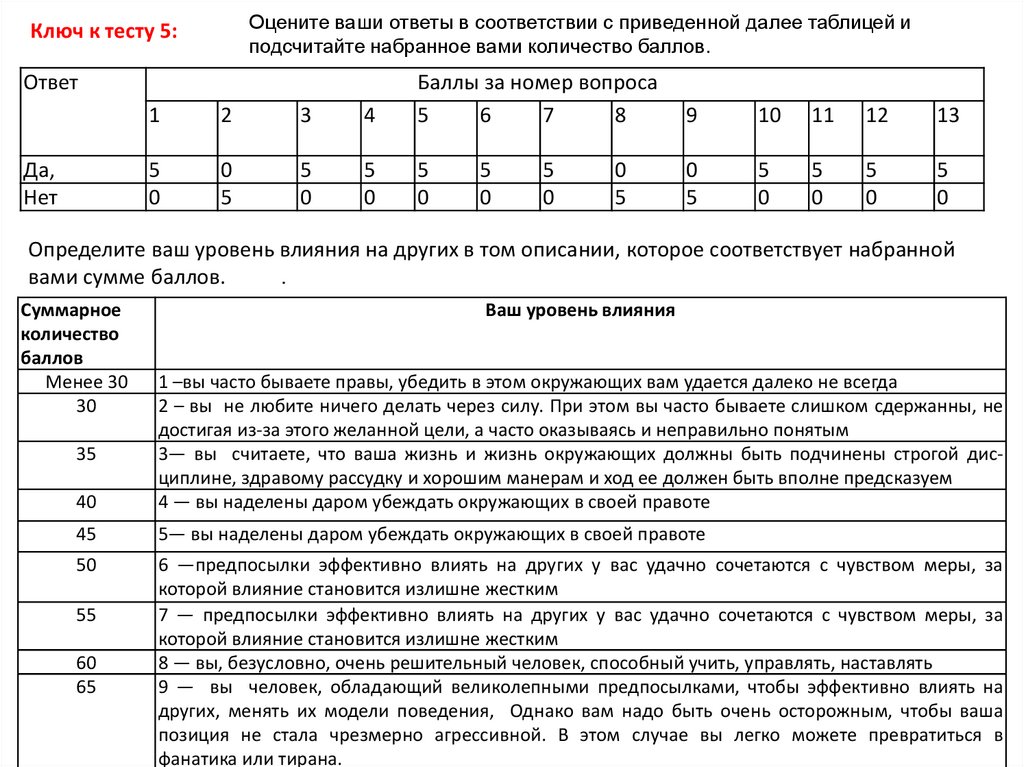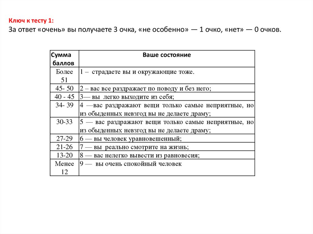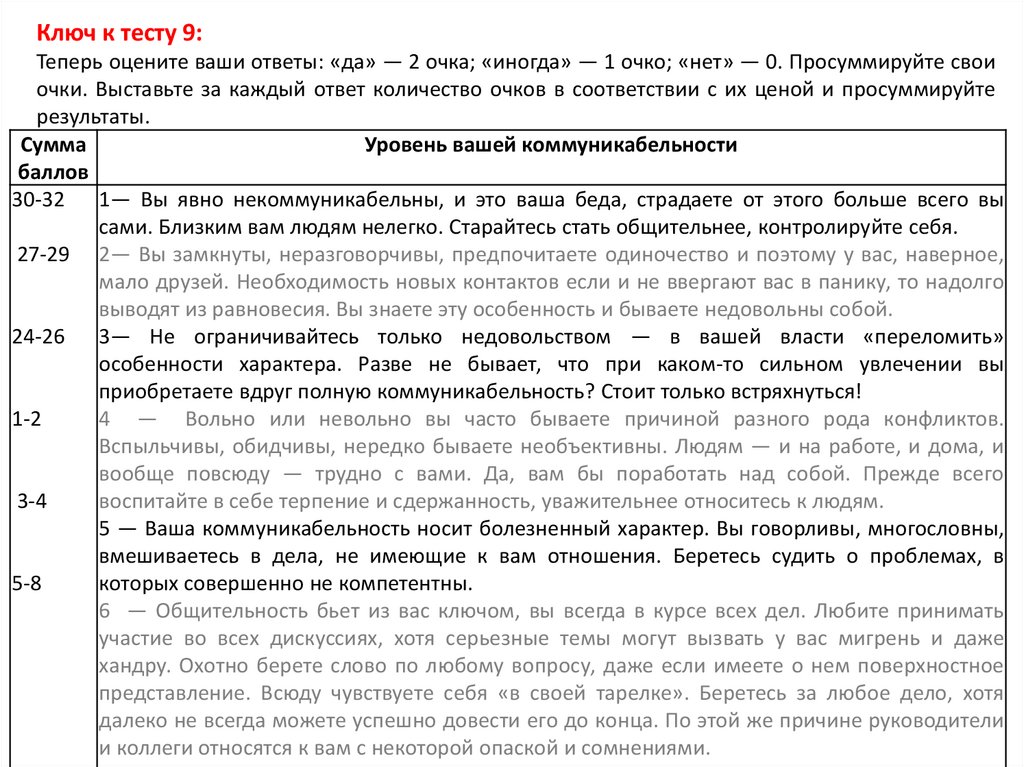 Ключ к тесту 1:За ответ «очень» вы получаете 3 очка, «не особенно» — 1 очко, «нет» — 0 очков.