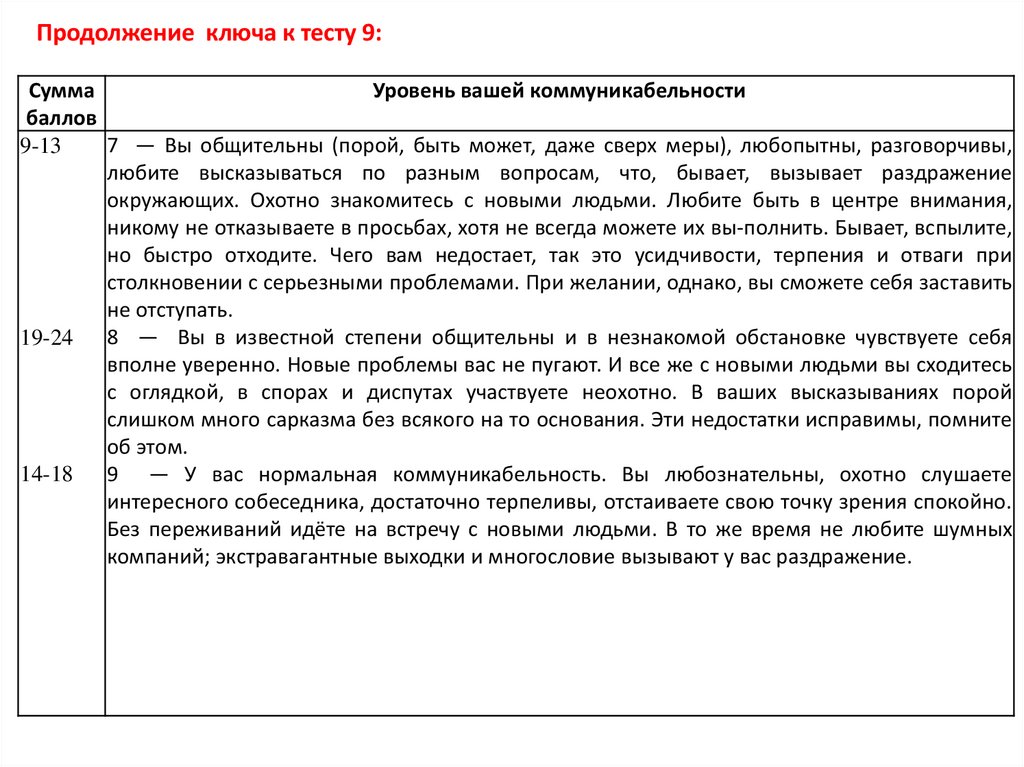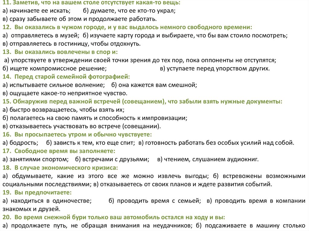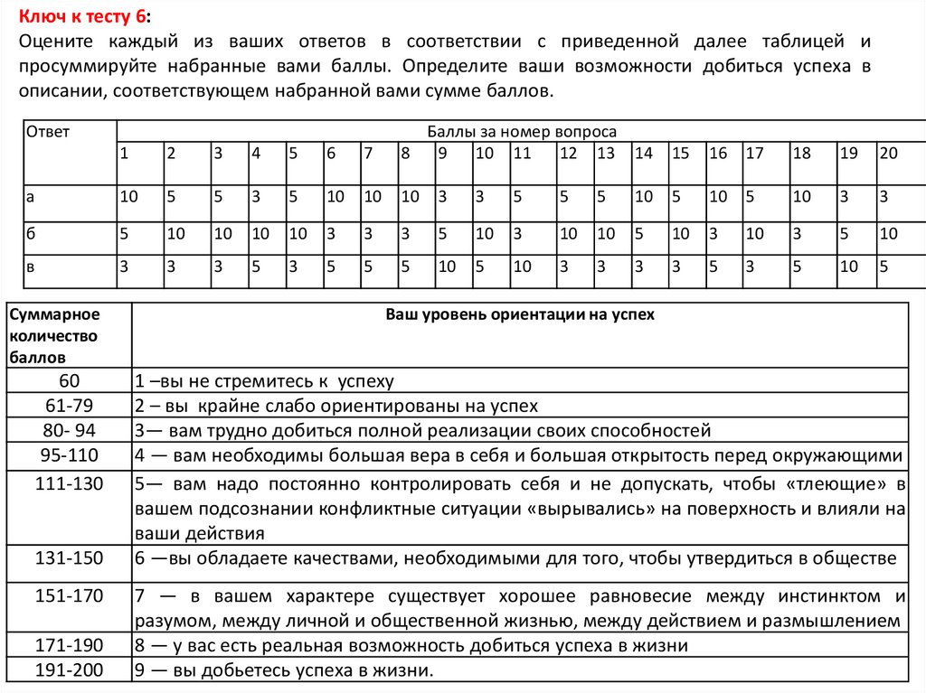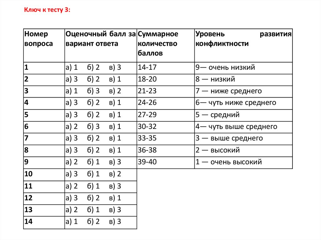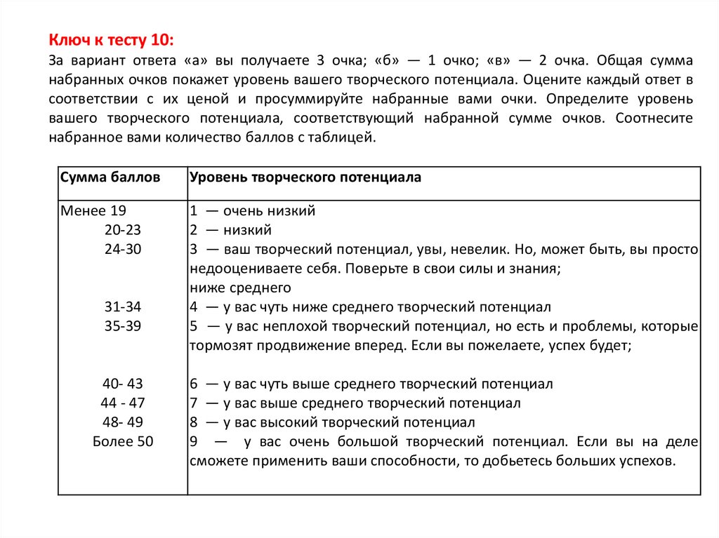 Ключ к тесту 10:За вариант ответа «а» вы получаете 3 очка; «б» — 1 очко; «в» — 2 очка. Общая сумма