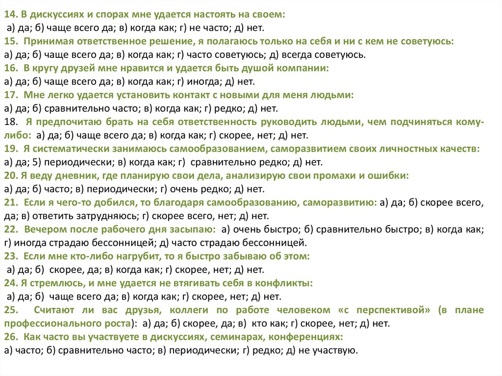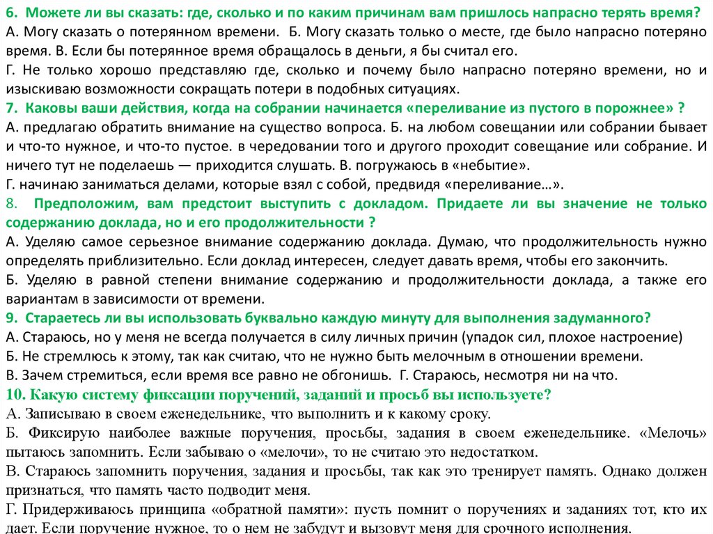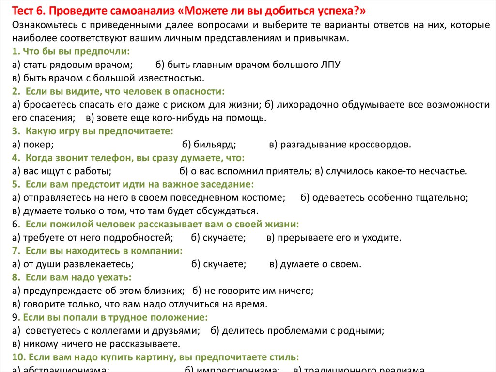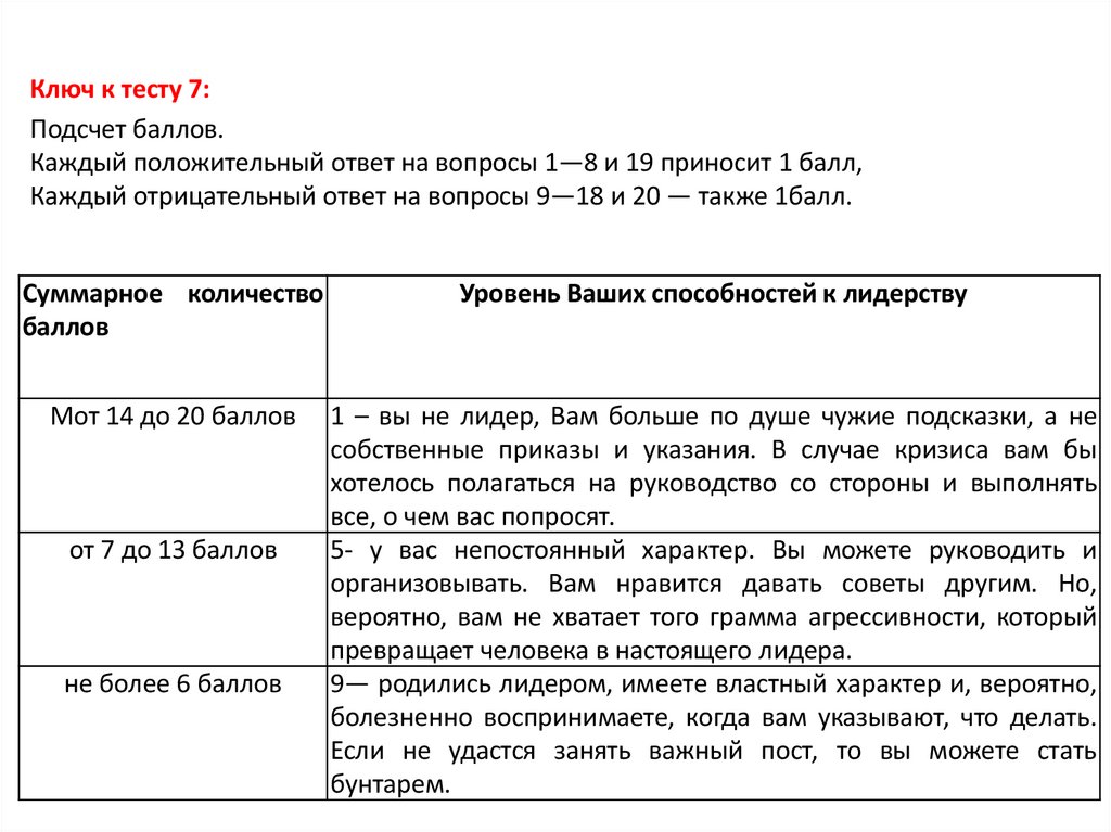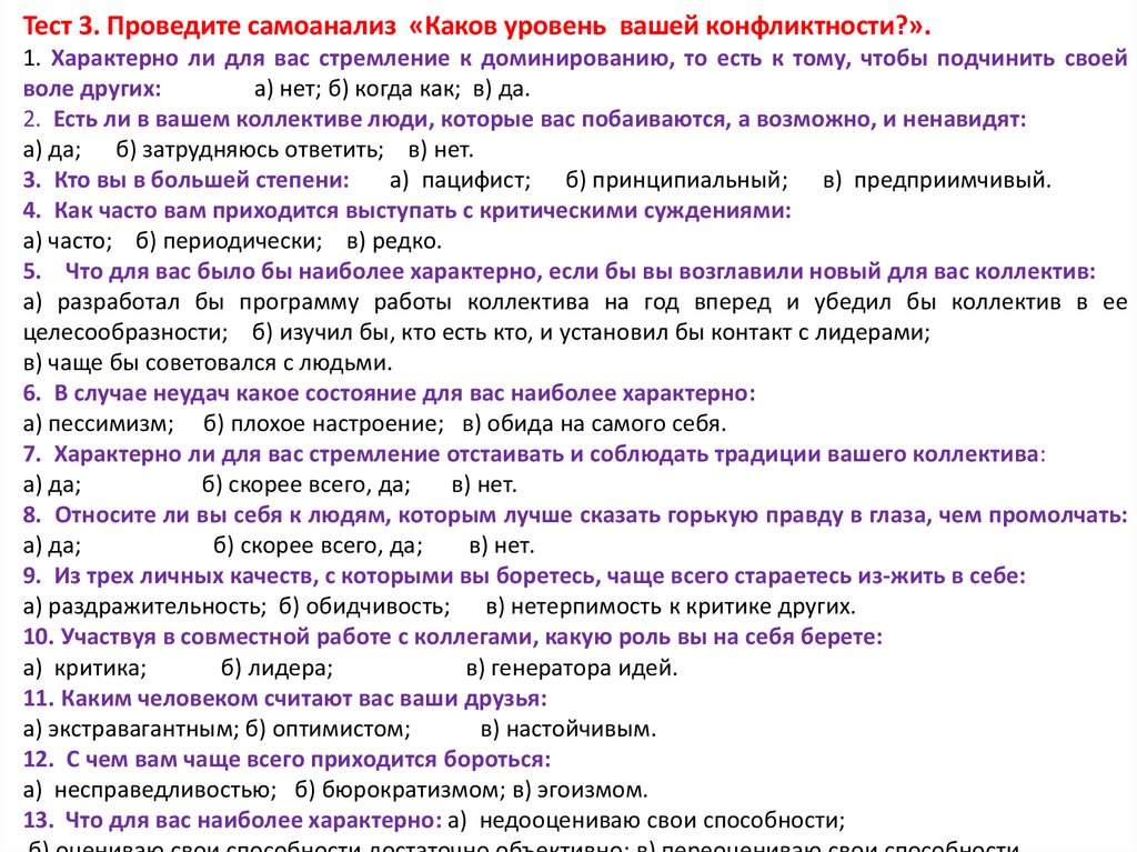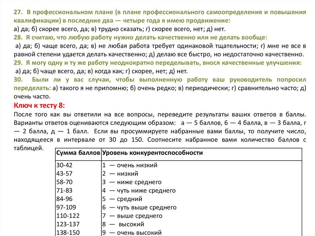 Ключ к тесту 10:За вариант ответа «а» вы получаете 3 очка; «б» — 1 очко; «в» — 2 очка. Общая сумма