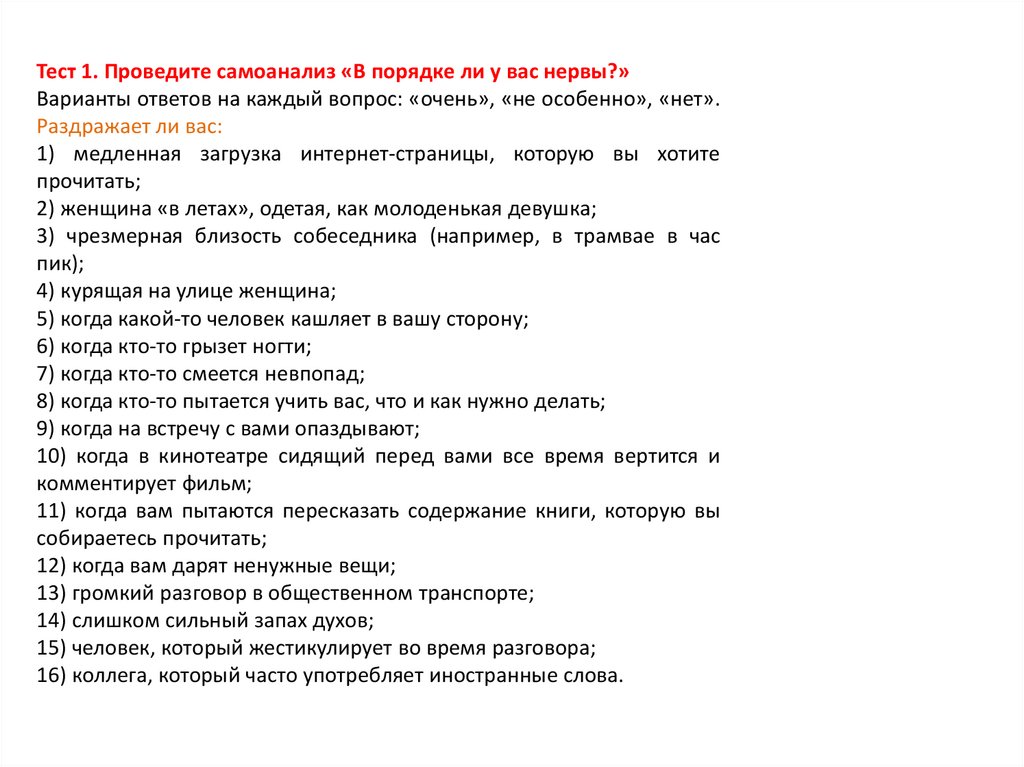Тест 1. Проведите самоанализ «В порядке ли у вас нервы?»Варианты ответов на каждый вопрос: «очень», «не особенно», «нет».