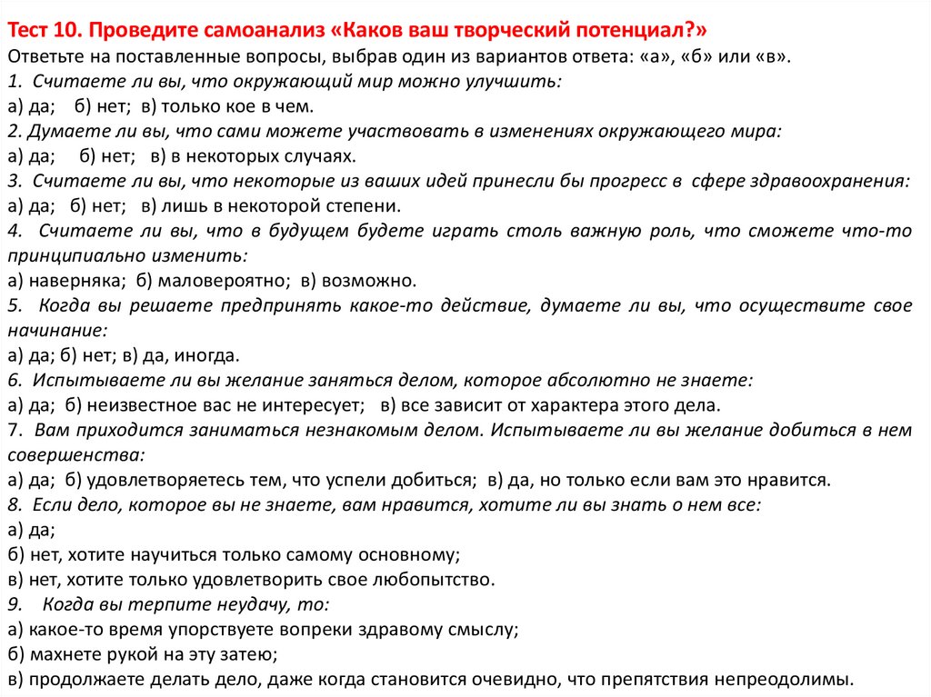 Тест 10. Проведите самоанализ «Каков ваш творческий потенциал?»Ответьте на поставленные вопросы, выбрав один из вариантов ответа: «а», «б» или «в».