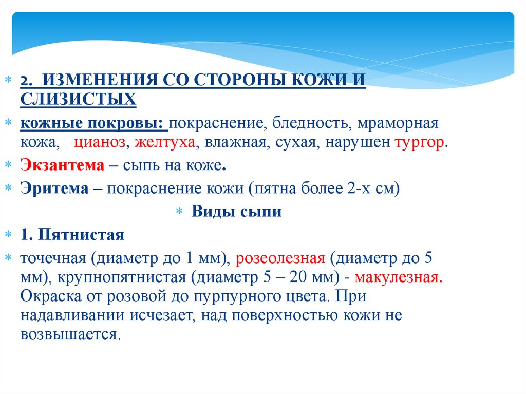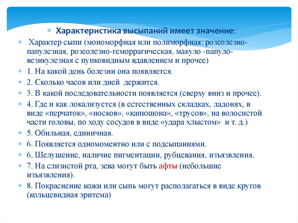 Характеристика высыпаний имеет значение:Характер сыпи (мономорфная или полиморфная: розеолезнопапулезная, розеолезно-геморрагическая, макуло -папуловезикулезная с пупковидным вдавлением и прочее)